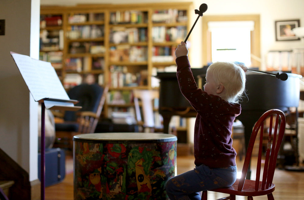 He’ll make a pretend musical instrument out of pretty much anything: a block of wood, a hose, a spoon, whatever he gets his hands on, and then he usually drags out a music stand and swipes someone’s music books to do his own “practicing.” He pretends to go to school…