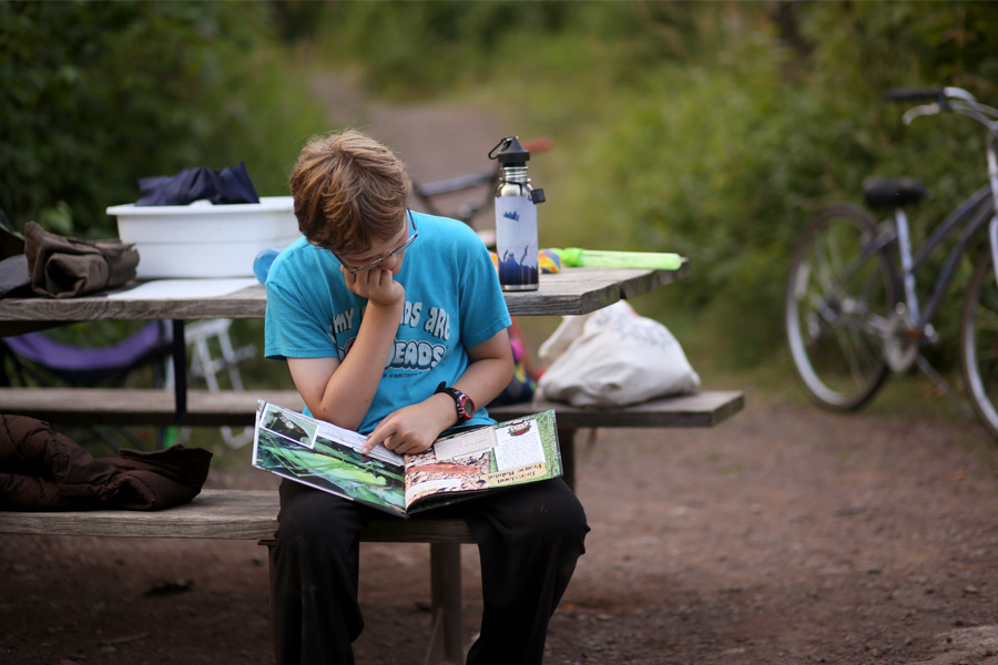 Next to the bathroom and water source was a Little Free Library, not for taking, but just for borrowing books to take back to the campsite. It was stocked with nature books and hiking books for grown ups, teenagers, and kids of all ages. The kidlets were absolutely thrilled. They loved bringing a book back to the campsite, reading it, and then riding their bikes back to the little library to exchange it for a different nature book. There were also novels about wilderness adventures, and picture books about historical events and people in Minnesota. It was perfect.