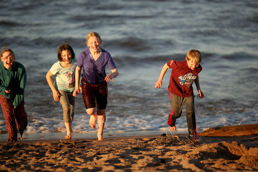 Sunday Night at the Beach has officially started! Everyone is delighted! The Little Cousins were visiting for the weekend and they really wanted to go to the sandy beach. There were so many of us we needed to take two vans to transport everyone there, so we sent the first load down right after supper with all the little people. I picked up YaYa from babysitting, and we loaded up Grandma Kathy and Mr. SP and went to pick up The Banana and one of our neighbors halfway down the street from choir practice. By the time we finally got to the end of Park Point, the little cousins were just getting into the car to come back home. They had gotten wet and cold.