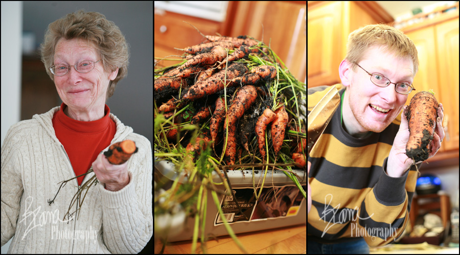 My mother-in-law sheepishly mentioned that she has carrots! Carrots for all of us! The carrots just happened to still be in the ground. Under the snow. Would we like to go dig them up? We looked at each other. We looked at the snow. We looked at each other. We raised our eyebrows. Carrots! Tasty carrots! She just didn’t quite get time to get out and dig them out yet. But we could! They were beautiful, beautiful carrots!