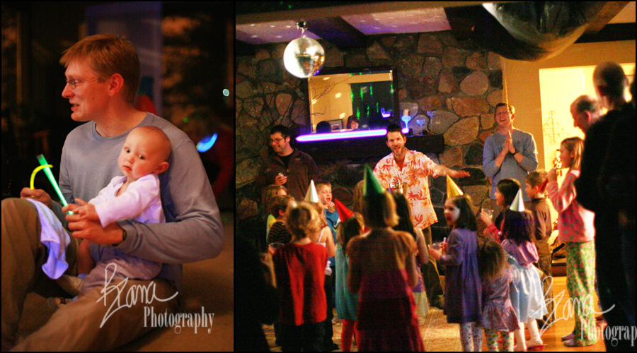 We were so very excited to attend the Kid New Year Bash up at our neighbors’ house at the top of the hill last night. It is always loads and loads of fun and excitement, better than any other New Years celebration as far as I’m concerned. There are noise makers used in a most noisy fashion, silly string, balloons, and tons of little feet hopping on the dance floor under the sparkly disco ball. Each year there is a spontaneous “tackle the dad” time. Dr. Peds was picked again this year. There were about thirty flailing kids on top of him on the floor (and a few collisions, but everyone was fine). Squirmy was enraptured by all the moving disco lights and all the noise and energy.