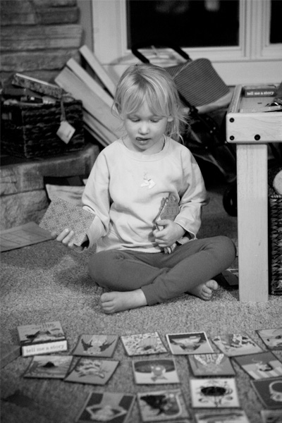 The Banana has written several stories that she dictated to me as I typed on my computer this week. I have to piece things together around all that foreign language I can’t understand. She’s also been busy making up stories with the storyteller cards. The other night she got ahold of two storyteller card boxes and mixed them together to create one amazing and very, very long story. Emphasis on very long. Luckily for me, Ya Ya happily sorted the cards back into the boxes they belonged in. The whole floor was covered in story cards lined up just so.