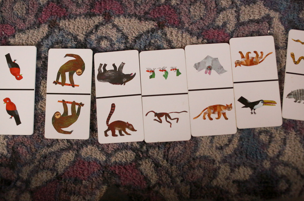 On a more positive note, he’s been enjoying getting to play age appropriate games with his bigger siblings, Dr. Peds and sometimes even me. Some of my favorite kid games to play are Sloth Dominoes and Picture Bendomino (both picture matching games that I don’t think you can find anymore, but have been hanging around our house since 2001). Sloth Dominoes is full of illustrations from Eric Carle’s Slowly Slowly, Said the Sloth book, and I love that Peanut Maximus can recognize a spider monkey and a double crested basilik. I also love the Snail Pace game. Dr. Peds likes Pengoloo.
