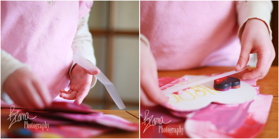 Our Valentine project, cards to take to preschool for Valentines Day, was a conglomeration of everything she likes to do: colorful sort- of washable paint (in shades of pink) mixed with glue, markers to write her name, and scotch tape. She loved searching in the crayon basket for broken crayons to melt into new, swirly heart shaped crayons, and best of all was the act of assembling all the parts together and imagining which friend she’d give which heart to. Big Sister YaYa has been working on homemade Valentines as well, for days and days. Mr. Sneaky Pants is giving out paper airplane Valentines that are not homemade. He loves the airplanes. He’s less enthused about addressing them, but we’re making progress.