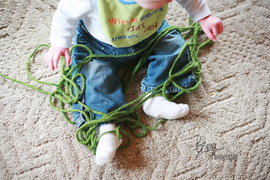 He had been eyeing this ball of thick green yarn for a long time, and one day someone left it JUST within reach. He had a lot of fun, a lot of slobbery, squealing fun.