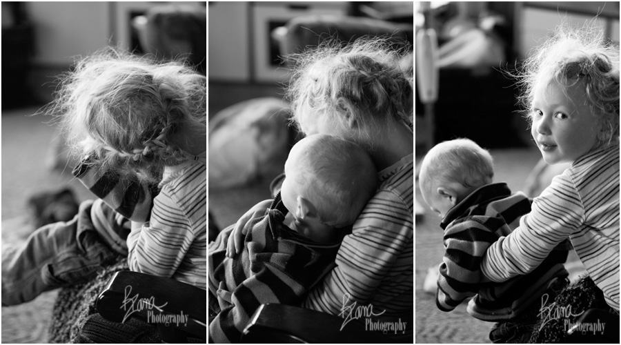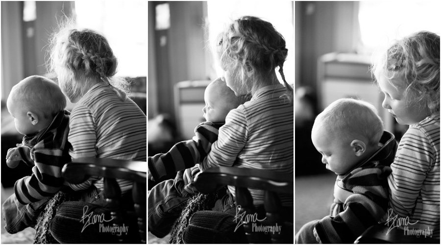 Now that Squirmy has become less fragile and more interactive, the Big Sisters around here spend a lot of time dragging him around. They drag him away from places he shouldn’t be. They drag him toward toys they’d like him to play with. They drag him away from all the little bits of things he finds in the corners on the floor and tries to eat. They drag him wherever they want, just because it’s fun. The Banana drags him close to her so she can “read” him books, which really means that she plunks him down and holds him tight so he can’t escape while she sings made up opera songs directly at his head with a board book open in her hands. She likes to hoist him up into the rocking chair where she spends a lot of time mothering him, whether or not he wants to mothered at that particular time. To his credit, Squirmy is a very patient baby who loves big sister attention.