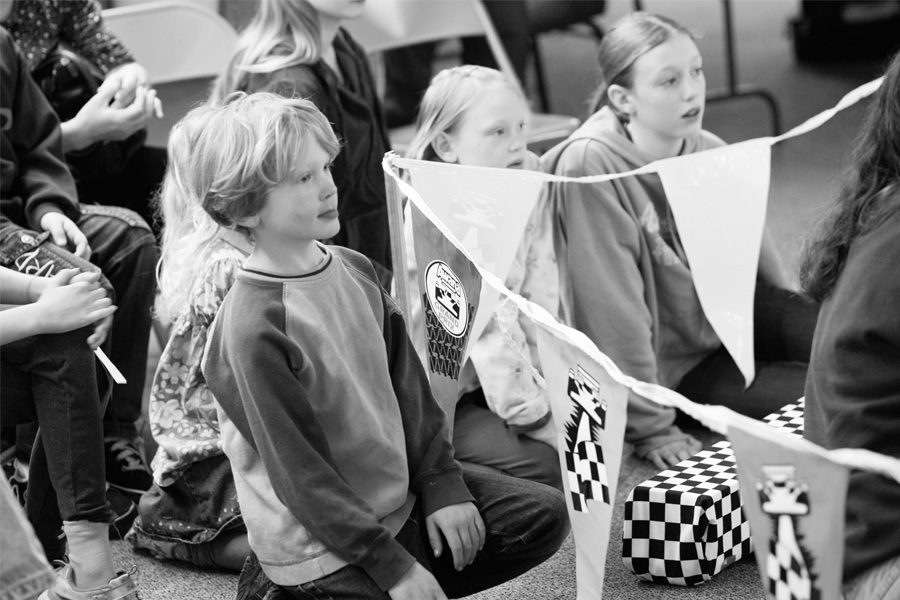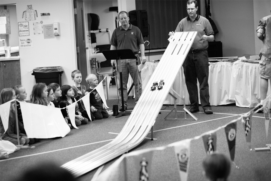 You can see Mr. SP’s car on the right lane in this picture, off to a great start. The wheels were a little wobbly, which slowed it down at the end of the track.