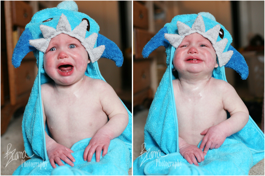 It turns out he LOVES taking a bath. The Banana and Mr. SP were decidedly less enthusiastic about bath taking at this stage, but YaYa was just like Squirmy. When he hears the water running, he wants to be IN the bathroom. If the bathwater belongs to someone else, he wants a part in it. When it’s his turn for a bath he waits at the edge of the tub drooling, beside himself with anticipation to get into the water. He loves bathtub toys. He loves washcloths. He really loves splashing, and splashing, and splashing. A bath makes him a happy, happy boy. Getting out of the bathtub does not make him happy in any way. Getting out of the bathtub is trauma in catastrophic proportions. It is met with wailing and flailing and much mayhem.