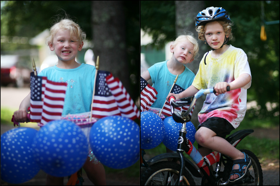 After waking up and eating breakfast, The Banana and Mr. Sneaky Pants spent the next couple of hours asking me every ten minutes if it was time to go down to the corner for the Fourth of July Kid Parade yet. The Fourth of July Kid Parade is a neighborhood tradition that takes place on our street, and neighbor kids and families come pouring in from all the nearby streets with their bikes and strollers and flags. It happens to be one of our favorite things about our neighborhood, a morning of festivities, kid fun, and lots of visiting. The kids and families walk/ride up the street past our house just a bit and turn around and go back to the start, while all the grandmas and grandpas and parents cheer them on from the sidewalk and front yards.