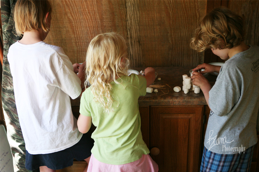 I have been meaning to have the kidlets do a marshmallow construction project for quite some time now, but I never remembered to buy the marshmallows when I was at the grocery store. We usually have some sort of marshmallows around for spontaneous Smore-making activitites, but there are rarely enough of them, nor are they of the correct size to really embark on a project like this. The other day I was shopping and The Banana asked for marshmallows, and I remembered to buy them. They’ve been sitting on the counter, nearly driving The Banana CRAZY with anticipation about what we were actually going to do with them for days. I kept saying, “When YaYa gets back from horse camp . . . ”