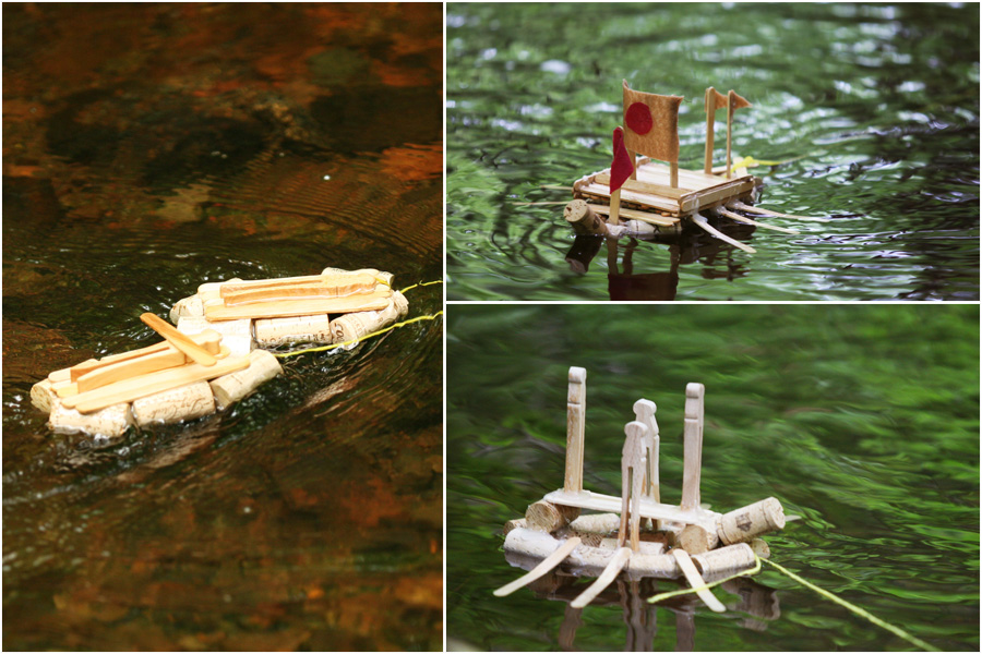 I ordered some cork, knowing that my boat building kidlets would have a great time with it. The day it came, they went right to work with the hot glue gun. Only one minor little mishap with the hot glue ensued, and they had a terrific time working together making these boats. Mr. SP fashioned two racing kayaks, YaYa made a historical sailing vessel, and The Banana had some help from her big sister to make her tall ship. Earlier this week we took them over to the secret creek to test them out. The kidlets were very excited that they floated so very well. There was lots of tromping up and down the stream, and not even a leach in sight! We have plans to take the boats to the beach too.