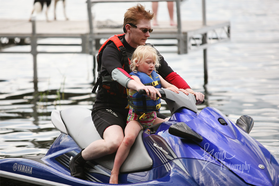 The Banana enjoys a nice jetski ride, and sometimes she even gets to do a little steering as they zip around the lake. You might recall that The Banana loves to be with people. She can hardly stand being alone and playing by herself. No matter what she is doing, she just gravitates toward doing it with someone else. Steering the jetski is no exception. No matter where they were on the lake, The Banana was headed toward other watercraft: kayaks, speed boats, pontoons, other jetskis. Greg kept explaining that they needed to stay away from other boats, but every time he’d move her back to the middle of nowhere, she’d head right for another group of people. Finally he asked her if she just needed to say hello to the other boats, or what? She grinned and shrugged. I guess she just needed to be closer to the other boats to see what they were doing.