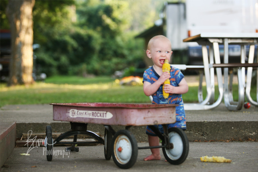 After supper, all the corn cob waste was loaded into this little red wagon. While everyone was busy cleaning up, Squirmy toddled right over there to investigate and have a little dessert. The cobs were wonderfully slimy with used butter, salt and pepper, and had such a magnificent texture. Plus, they were rather tasty. He would have unloaded the whole wagon and tried each piece if those grown ups would have let him.