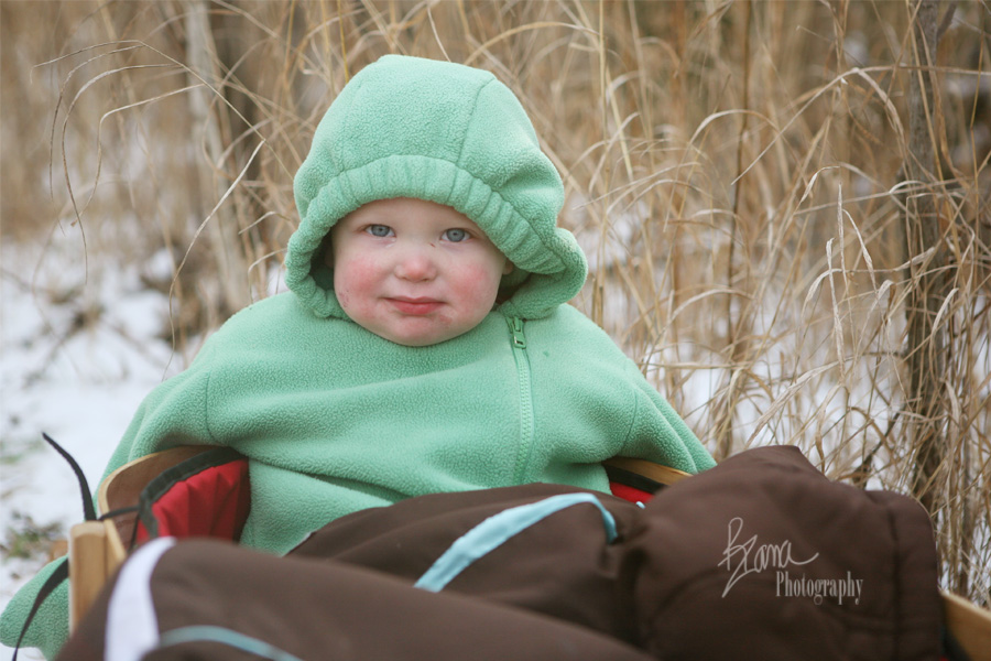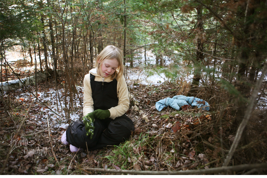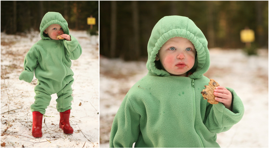 Not one to be left in the dust by any means, The Banana was also smitten with the axes, especially the one with a fancy stamped leather cover. She worked with Dr. Peds to cut down the second tree, while YaYa built winter fairy houses on the forest floor nearby. Mr. Trouble on Two Feet was nestled in his sled observing. He was just starting to get a little cold and grouchy when we found the cookies. Holding his own cookie and eating and eating made him a very happy small person. At the entrance to the forest we ate cookies, drank cocoa, touched animal skins, learned about trees, and the kidlets and Dr. Peds slurped up some chili. By then Mr. SP and The Banana declared the weather too warm for winter coats, so they zipped about in their shirts and snowpants. Mr. SP was wearing a short sleeved shirt. It had to be chilly, but he was very determined about not needing a coat. Everyone else in the forest was bundled up cozily.