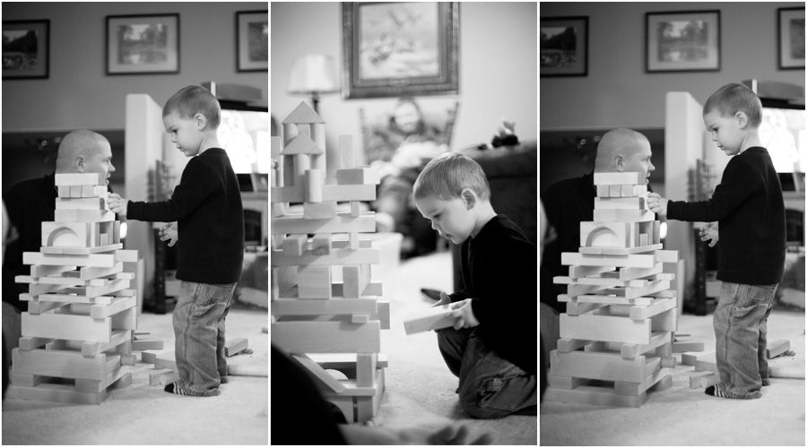 Jack and YaYa and all of the smart grown ups in the room built tracks for cars and trains. There was a bit of indoor baseball practice. We played with all of Jack’s new Christmas presents. Jack drummed on his drum for me, but when I asked if I could drum for him, he looked at me like I was crazy and said simply, “No.” I hooted with laughter. Jack likes trucks and cars and combines. He and my brother build some terrific towers with blocks. You know how much heart soars when I see kids building things with blocks. Blocks are my favorite toys ever.