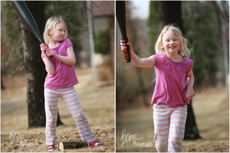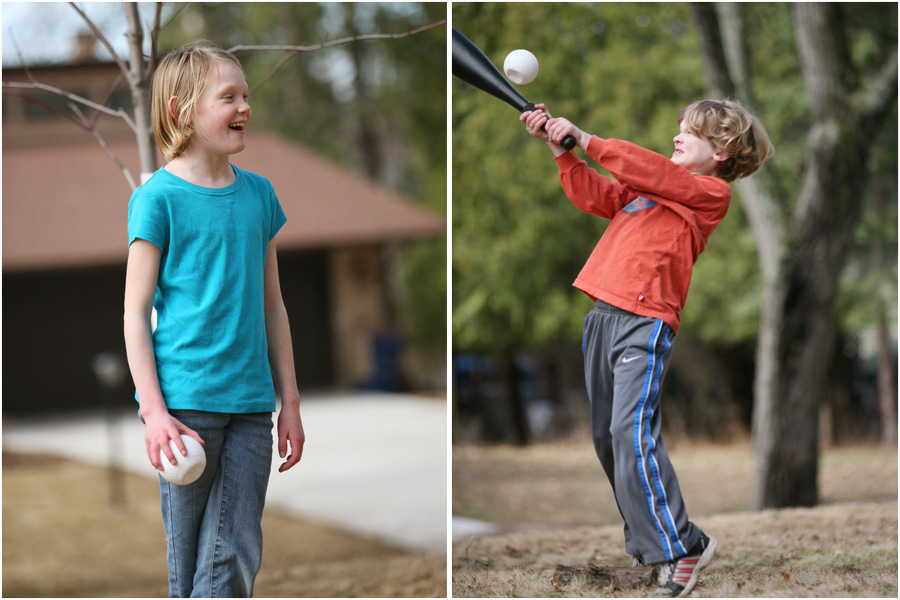 We aren’t sports fans around here. We just aren’t. By nature of just being our children, the kidlets have had very, very limited exposure to baseball. In fact, if they’ve had any exposure to baseball, it probably came in gym class at school. I looked out the window on Saturday afternoon, and there was a baseball game taking place in my front yard, a very convoluted baseball game. They had taken a few logs and strewn them around for bases. YaYa was in charge of this and all other things regarding the game. She was the pitcher extraordinaire. She throws like me. Let’s just say the pitches were more than slightly a bit wild and unpredictable. She was also in charge of making all the rules to the game. Score was being kept on our large chalkboard which had temporarily moved to the front yard. Because both teams were short handed, as in there was only one person on each team because she was the pitcher all the time, batting took place from all the bases, not just home plate. You could only advance one base at a time, and you kept on advancing around the diamond until you either struck out or made it home. The other team was on base at the same time as the batting team, and if you did well, they could somehow score as well.