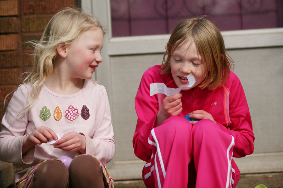 Fervent trading of tokens, currency and coupons took place, and I was doubled up with laughter pretty much the whole time. YaYa tried to trade the vaseline egg to her chapstick loving sister, but she sort of turned up her nose and the big sister was left with the prize. Mr. SP and The Banana said it was the best egg hunt ever. YaYa mentioned that it was certainly creative.