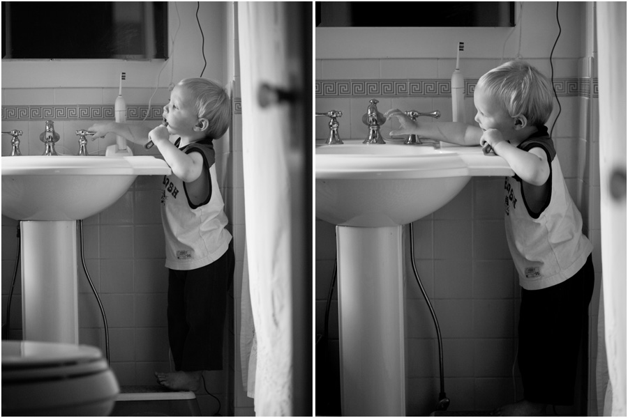 Mr. Trouble on Feet has loved his toothbrush for quite some time, and now he’s learned to climb up on the step stool and turn on the cold water faucet himself. It’s a very big deal, and one of his favorite pastimes. Off and on and off and on goes the cold water. He often ends up soaking wet, but because it’s the middle of summer, I generally don’t care about that.
