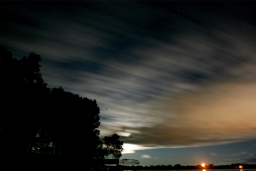 I was pretty excited about this night time extended exposure image that I took by the light of the moon last weekend. I walked to the end of the dock and propped the camera up on a rock. I love how the exposure was long enough to capture the clouds moving, and those static stars behind.