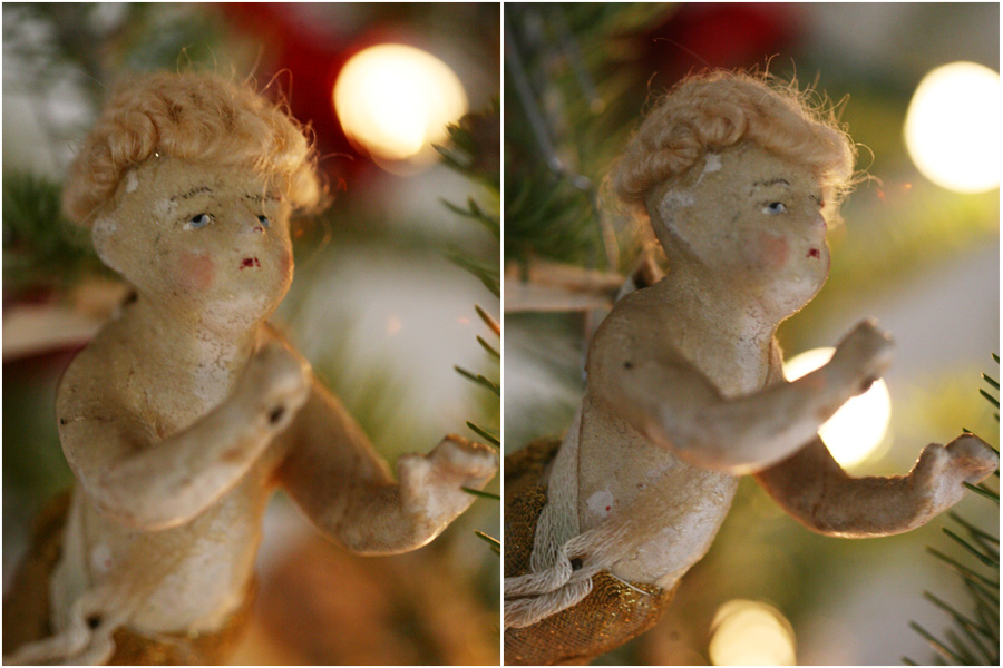 Regardless, I am so happy to have this on my tree! I look at it all the time! I love every little scuff mark on it, and the chips and the uniquely painted face. We think that my great-great-grandmother (the great-great-great grandmother of my kids!) received it as a child, which would have happened in Germany. It means that it is probably around a hundred and fifty years old or so, although we don’t know exactly. I love that this ornament has come out for every Christmas for that many years. I love imagining all the interesting moments this ornament has been privy to.