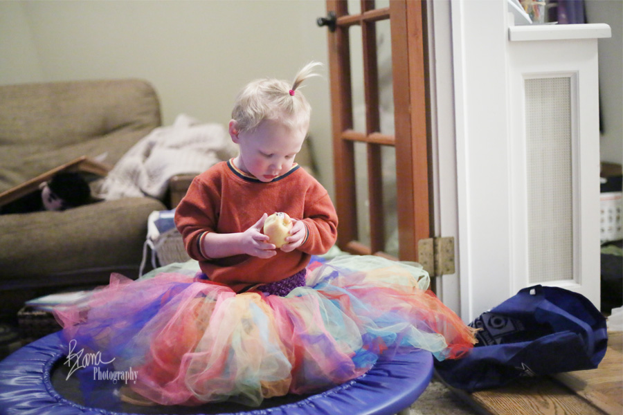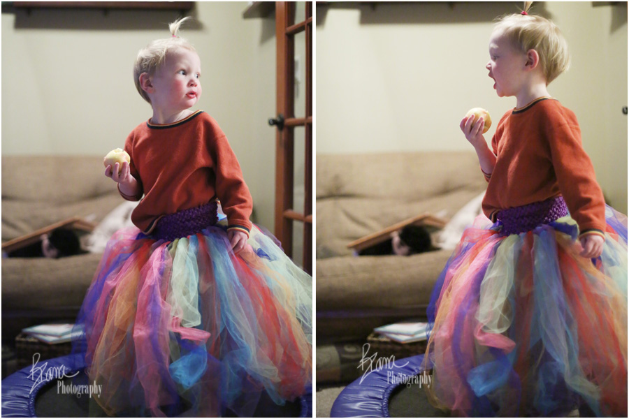 He loves his big sisters so much, so it makes perfect sense to try to be just like them, with pony tails and tutus. They oblige him at every turn, and with their excellent reasoning skills, they’ve even managed to convince him that tutus are for home only, not for riding to other places in the blue car, which is what Mr. TOF calls the van. He’s always running up to The Banana with a pony tail tie, asking for her to put it in his hair, and what could be better than bopping on the trampoline with a tutu?