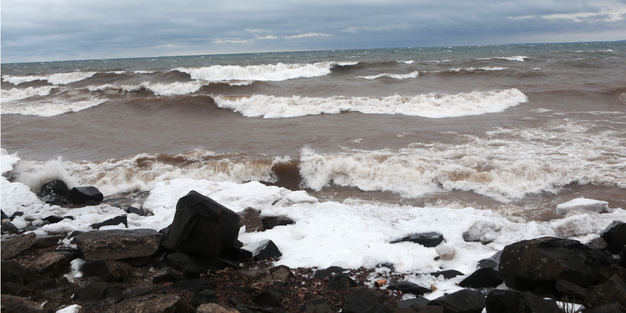My pictures never do a big storm on Lake Superior justice. For one thing, it’s hard to show the size of the waves. The spray was climbing 30 feet in the air at least! The water was just exploding onto the rocks. The roar was wonderful. The most important thing missing from these images from this morning is the range of colors that I just couldn’t quite capture with the camera. (To be fair, I didn’t try to set a white balance because I could hardly stand up and take the pictures). The water close to shore was a deep, ominous chocolate brown, and then farther out a rich seagreen, and still farther out deep, dark blue. Best of all, the deep dark greenish blue hue of the water far away clashed with the more true dark blue of the dark, heavy clouds hanging low on the horizon, and that blue faded into lighter, brighter blue farther up into the sky. It was stunning. The clouds had such an interesting texture contrasted with the texture of the water.