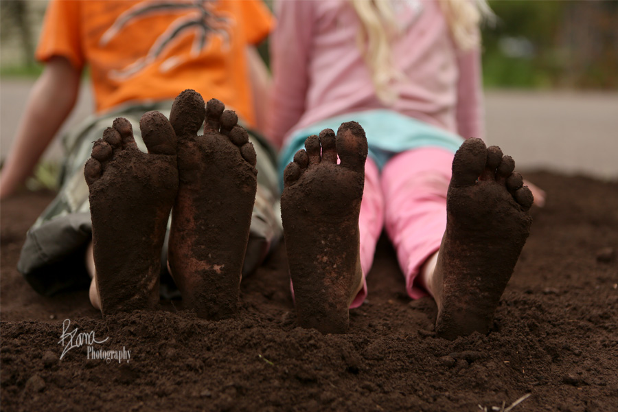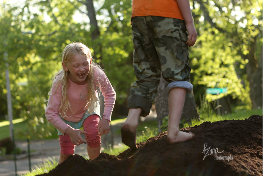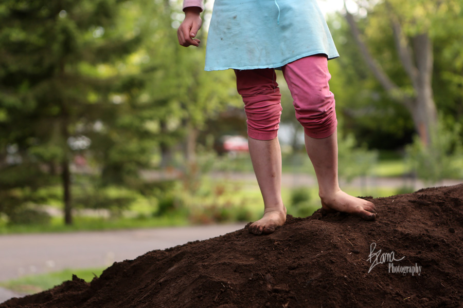 Within not even 30 seconds of the truck rounding the corner, the biggest three kidlets were on top of that pile of dirt dancing. While YaYa tired of the affair after about five minutes or so, that wasn’t the case for the other three. Mr. TOF grabbed a shovel and actually helped Dr. Peds move dirt for a couple of hours. He was so thrilled to be moving dirt. The middle kidlets spent just as long tromping and dancing and yelping in the dirt. Up, down and around the mound they traversed until it was packed down solid. When Dr. Peds filled in the sunken areas they pounded the dirt down like grape stompers with their bare feet, singing crazy songs as loud as they could. There were spats of mudballs tossed to and fro. It was a ruckus and an adventure, and they were enjoying every second of it.