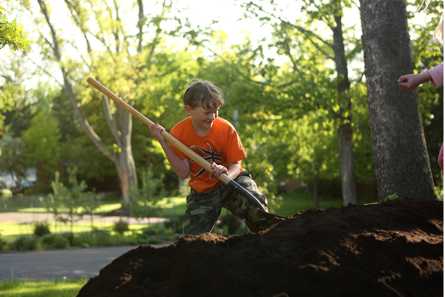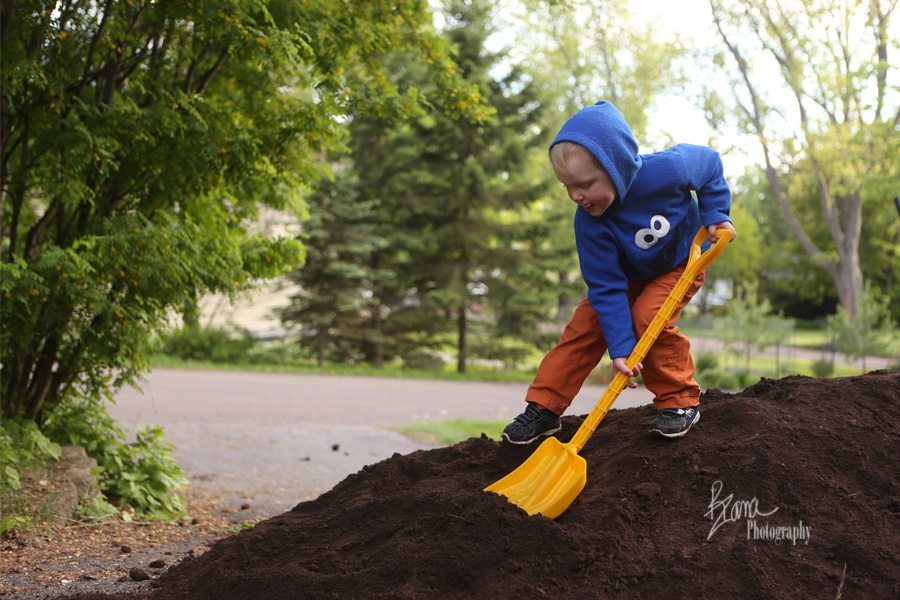 The delivery truck pulled up right as the freshly showered kidlets (back from swimming lessons) and I were in the middle of eating supper on the deck. Of course, supper was abandoned immediately, because who doesn’t want to see a load of dirt dumped on your very own driveway? It was a big deal. They all watched solemnly, with big eyes while the back of the truck was raised as tall as I it could go. They giggled as the worker who had to shovel the last bits of dirt off slipped and slided on the slanted truck bed. The truck drove away.