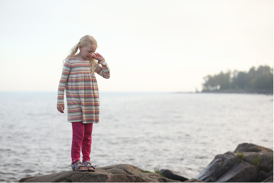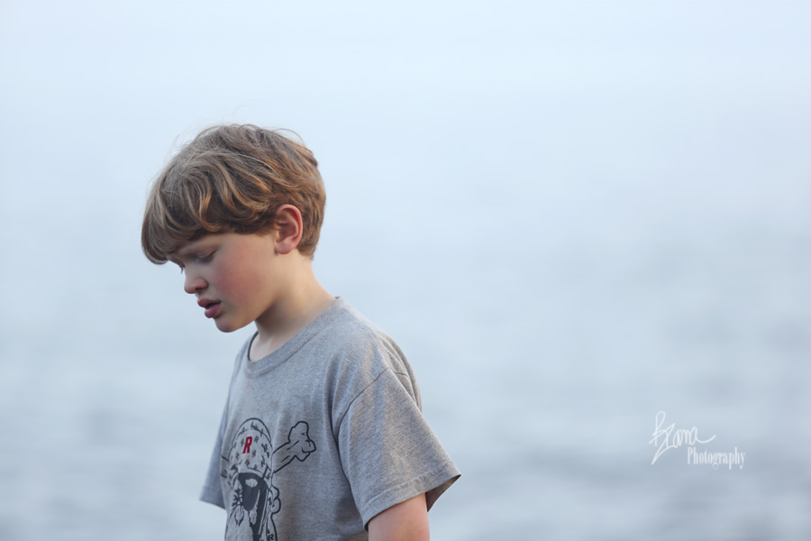 It was warm and muggy at the top of the hill. After a squabbly and grouchy sort of Sunday, we packed an ultra simple picnic, and headed down to the rocky beach. YaYa was off to camp, so it was just the three smaller kidlets. The beach was cool and comfortable. As we drove down the hill, the fog was hanging out over the water, rolling around in swirls. The sunlight at the beach was weak, almost nonexistent, and the breeze was light and chilly. Luckily we found an extra sweater belonging to The Banana in the car for Mr. TOF, or he would have been freezing in his short sleeve shirt. We enjoyed eating together, and then did just a teensy bit of playing before packing things up and heading back up the hill.