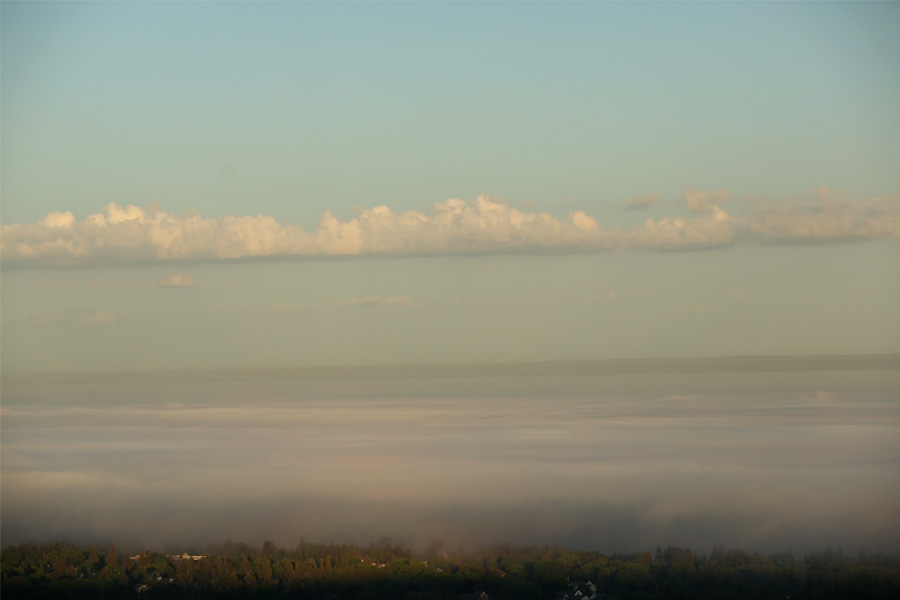 On the way up we hit an atmospheric change and every single window in the fan instantaneously fogged up with thick condensation! We were back in the land of warm and humid! We drove over to Hawks Ridge to the lookout to watch the fog swirling down on the lake. Talons of thick moisture were reaching over the trees at the edge of the neighborhood. On top of the hill it was sunny and sticky!