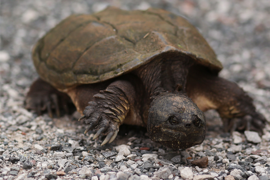 On Friday afternoon Mr. Trouble on Feet and I drove to Hartley Nature Center to pick up The Banana and Mr. Sneaky Pants from their afternoon classes (which they loved). I parked the car and happened to look over at the start to one of the hiking trails and saw a mysterious object. At first I thought it might be a really big rock, but it was such a strange color. Within a few steps, I confirmed my suspicion that it could be a turtle. What a turtle it was! It was a huge female snapping turtle, and she was acting a little bit unusual, hanging around a certain spot on the hiking trail and not moving very fast, even though a crowd of people was accumulating. A snapping turtle can move quite quickly when it wants to, someone remarked, and I certainly believed them.