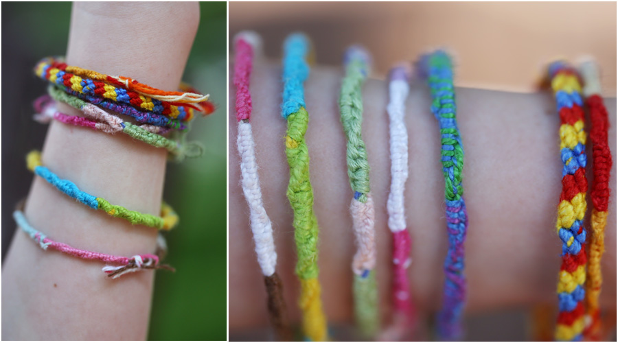 At camp YaYa also finally learned to make friendship bracelets, the perfect camp activity! Last summer I tried to show her how to make these, to give her something to do on a long, hot, boring afternoon, but she wasn’t all that interested, and I don’t think she finished the first bracelet. At camp she made scores of them, and she and her friends traded them back and forth. She spent her days at home knotting away. I have a fondness for friendship bracelets. I had such fun learning to make them with my Nebraska cousins, and in grades 6-8, I remember trading bracelets all the time with my friends.