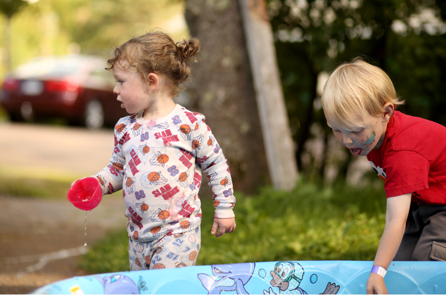 Lots and lots of playing took place the whole weekend, along with several fun outings. On Friday night the big kidlets were at a fun night at church, and Cousin Alex was napping. Kah Kah Kah and Mr. TOF entertained themselves with some water they found in the swimming pool. I forget how much just a little bit of water can entertain little people! These two had a delightful time together. It was really fun to watch them interact. Mr. TOF loves his Kah Kah Kah. She’s always been one of his favorite people.