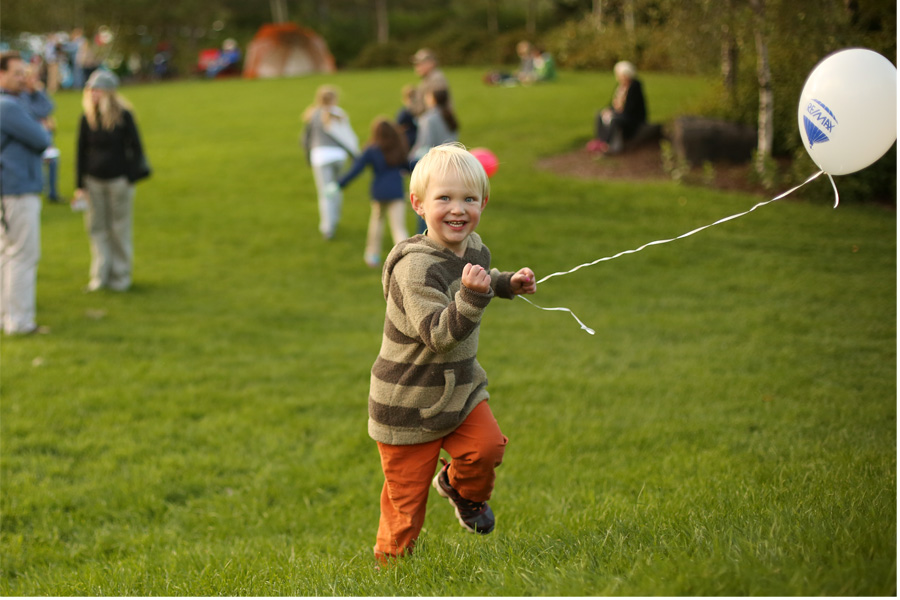 As the sun began to sink, it started to get chilly. Around the stage all of the balloon baskets were positioned in a semi-circle, and as the live music started (a Scottish bagpipe and drum group, followed by the brass and percussion section from the symphony) the balloons would simultaneously blast their burners along with the applause of the audience. They called it the ring of fire, and it significantly warmed things up and lit up the scene! As it got darker the effect was more and more dramatic. We ran into a group of friends, and the kids had a great time flittering about while the grown ups chatted and enjoyed the music. Mr. TOF was a dancing machine! He was so into the music, bee-bopping away with his helium balloon, having a terrific time.