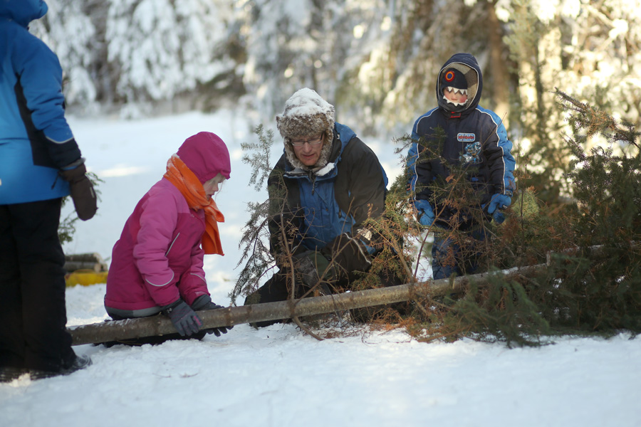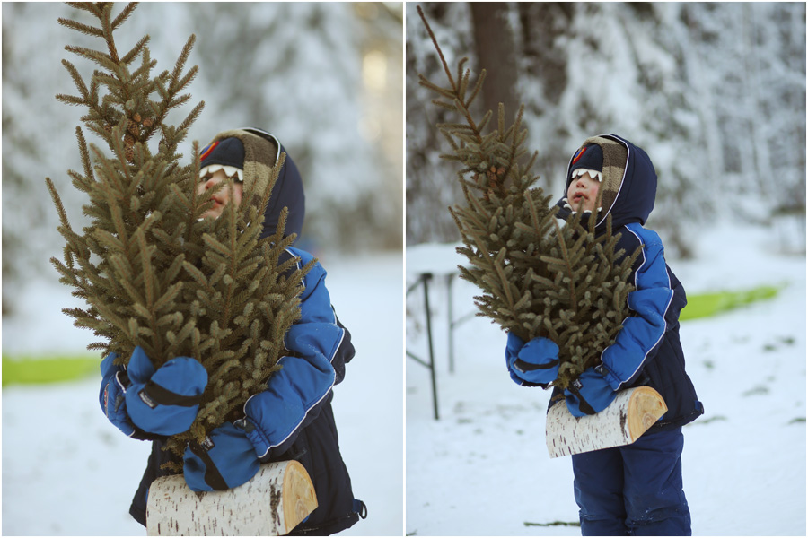We actually ended up getting three trees from the forest. It was kind of my plan all along to have the usual two big trees in the living room and playroom, and then maybe a small tree in the dining room stuck into a metal bucket. I didn’t know how that would all work out, given the temperatures and the quest of transporting the trees back home. While we were sawing down the second, sparse tree, a family cut down a different tree nearby, and stuck a tree top they had previously sawed down in a snowbank about thirty feet away from where we were standing. The tree top had a lot of character (I think they just wanted a bigger one) so after they left, I snatched it right out of the snowbank. The Banana was happy to carry it out of the woods for me. It’s a cute little thing.
