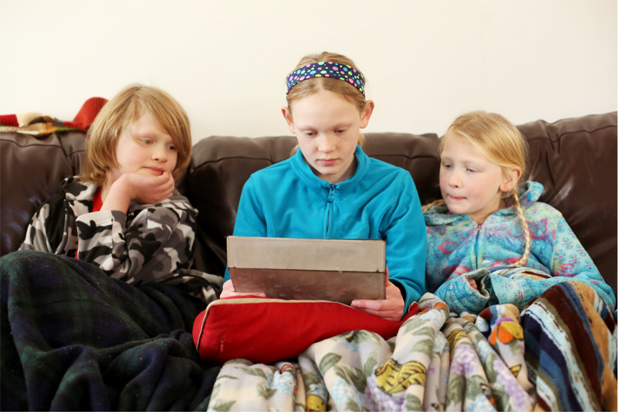 At noon I broke up the sewing party and we headed out to Bixby’s for lunch. It was YaYa’s request. She likes the garden turkey sandwich there. I took my camera along, but she begged and pleaded for me not to document her lunch experience, and because it was her birthday, I relented. It was 30 degrees, the warmest it has been (and will be?) for weeks, and I so wanted to throw everyone outside or take them sledding or something, but the birthday girl had other plans. It seems that a certain Despicable Me movie had been released for renting the day before. Although The Banana viewed it at the theater this summer with Dr. Peds, Mr. SP and YaYa were away riding horses in the Badlands with Grandma Kathy, and they have been waiting months and months to see this movie. Dr. Peds downloaded it the night before and told them they could watch it as many times as they wanted to the next day. They watched twice: once in the afternoon and once in the evening. Although they look intensely serious in this image, there was significant roaring laughter coming from their direction the whole length of the movie.