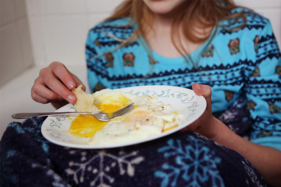 YaYa’s first request regarding her twelfth birthday was that she would be allowed to sleep in as long as possible. Her second request was sunny side eggs for breakfast. Dr. Peds is usually the sunny side egg maker here, and it was slated for work that day, but things worked out and he was able to stay at home long enough to let YaYa sleep and then cook the eggs. There was actually a lot of resisting the tradition of breakfast in the bathtub, because sunny side eggs are hard to eat without a table. However, I was so sad at the prospect of not following tradition on the birthday of the girl who STARTED the tradition (even though these days there is a bit of complaining about the bathtub being squished) that a compromise was reached. The first half of breakfast was held in the bathtub for the sake of photographic opportunities. The second half was held at the table. There was drama to spare all around.