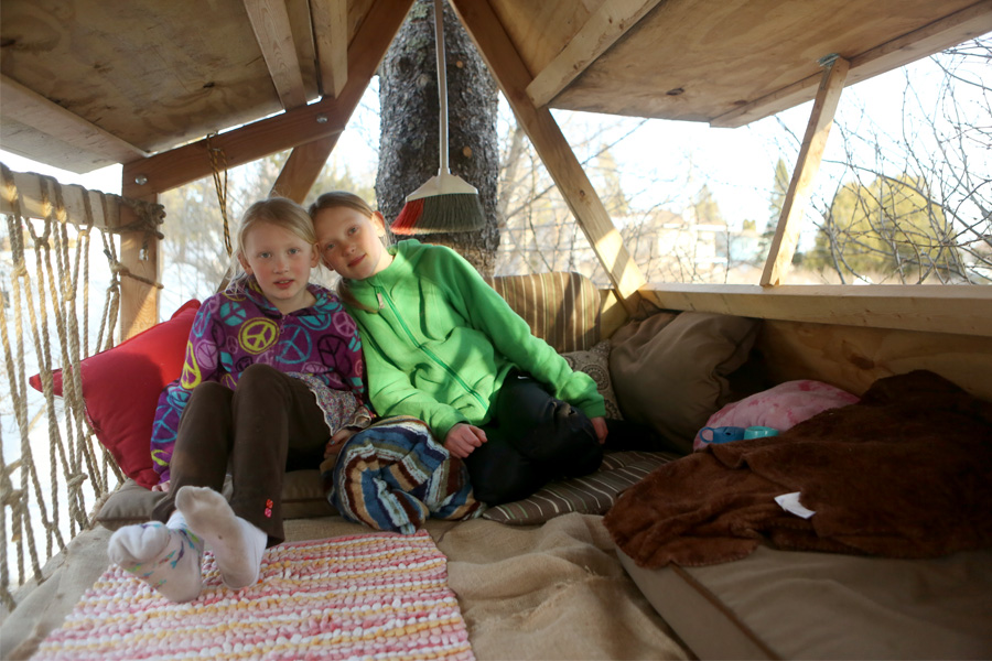 All along I’ve loved that my kidlets now have a treehouse, but this spring I’m questioning how we ever lived without one. It has been the place to be these past few days. They’ve brought snacks up there. They dragged burlap up for carpet, and all the lawn chair cushions for seating. They transported blankets up to their cozy loft, and made a shelf on the edge of the tree for muddy boots, which are not allowed inside, apparently. Neighbors have been over playing in the treehouse. Library books have been read up there. I love that they have somewhere fun to play even though we are still up to our knees in icy snow.