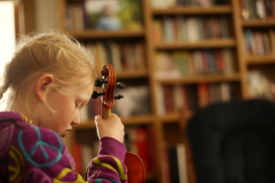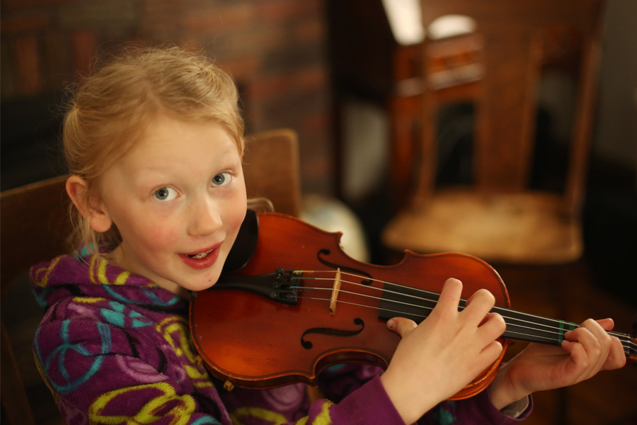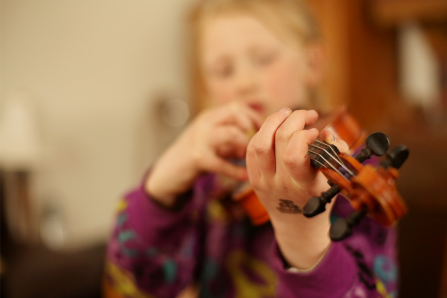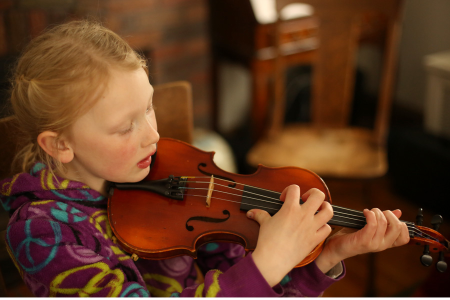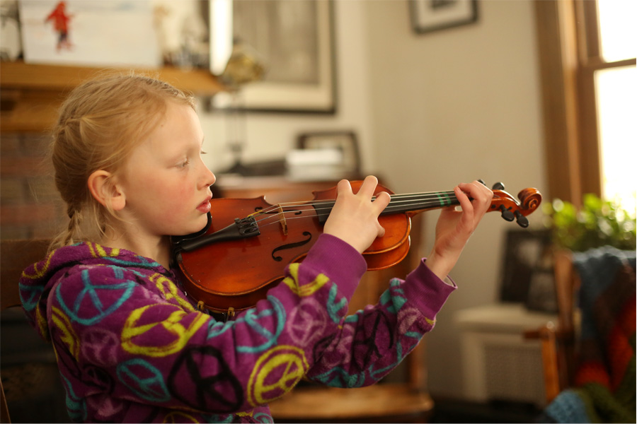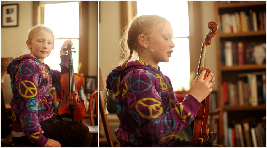 Because of the family schedule during the school week, The Banana gets up at 5:45 every morning to practice violin before school. She doesn’t complain a bit. I say the word “Violin” and she hops right off the top bunk bed and zooms downstairs. Sometimes if there is time after she practices piano in the evening, the violin comes back out a second time. That’s dedication. Violin is hard work, but she’s doing amazingly well. The first week, when these images were taken she was practicing pizzicato to learn some notes on the strings. This week we have added bowing, which is so complex, yet she’s improving so much so quickly. She’s so focused and has such a great attitude.