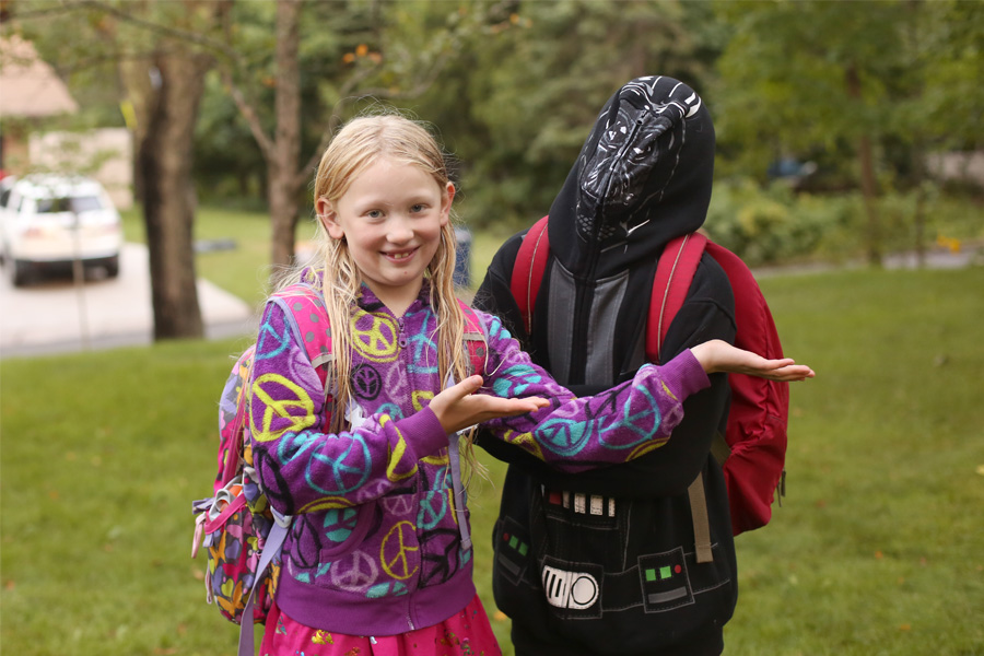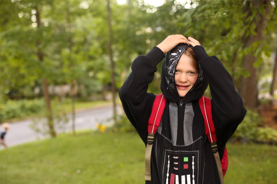 Typically we don’t purchase a lot of clothing when taking care of our back to school shopping. This is mostly because our kids clothing comes from a variety of sources, and most of the time those sources do not involve regular stores. However, when Dr. Peds and Mr. SP were out gathering things on the school supply list, they came across this wonderful Darth Vader sweatshirt, with a hood that can be seen through from the inside but not the outside. I don’t think it took much convincing from Mr. SP to get the sweatshirt in the shopping cart, and I have to admit that while I’m really not into Star Wars, I do see the appeal of a see-through hood that zips up all the way, attached to a comfortable sweatshirt. I kind of wish I had hoods like that on my favorite sweatshirts. Sometimes a person just has a momentary need to close off for awhile. It’s safe to say that Mr. SP really, really loves this sweatshirt, and was definitely going to wear it on the first day of school, even though I was very adamant that the hood could not be up during school or on the bus.