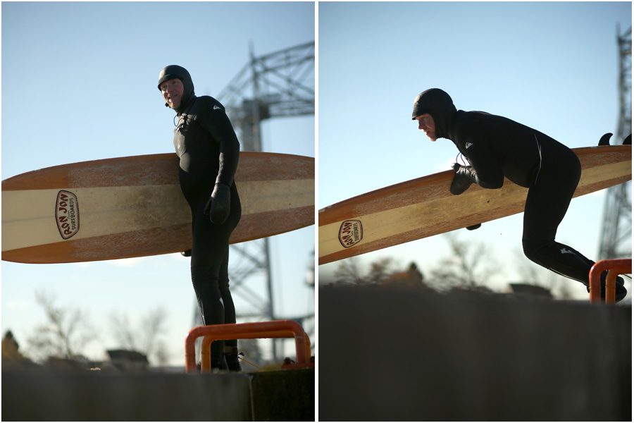 We decided to walk across the lift bridge to get a better look at the surfers out off of Park Point. There were a group of long board surfers who were super smart. They’d ride the waves in, and then rather than wasting all that energy paddling back out against the force of the waves with their boards, they just hopped right out of the water, ran over to the shipping canal, carried their board half way down and jumped back in to catch the next wave. Well, maybe not the next wave, because it’s actually harder to find the right wave than one would think, apparently, and surfers spend a lot of time floating out there waiting for the right wave.