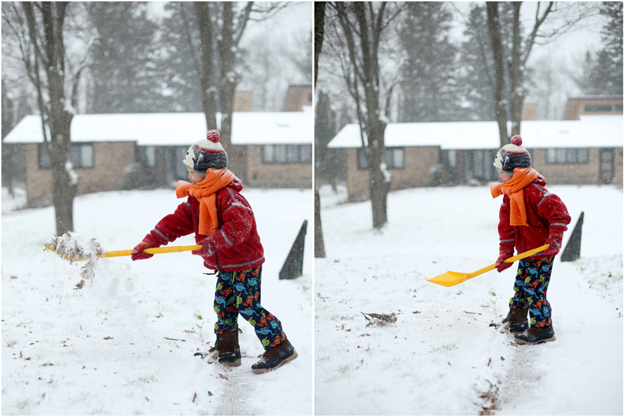 Mr. Trouble on Feet spent nearly the entire afternoon outside. Every once in awhile he’d venture back in to warm up, and then out he’d go with his shovel again. He looked at Dr. Peds at one point and said, “I’m not sure how many times I will go outside today. Maybe seven. Maybe more.” This kidlet is far more willing to go outside than any other kidlet in our family ever was and is, and he’s motivated enough to bundle himself up, only really asking for help zipping his coat and figuring out which foot belongs on which boot.