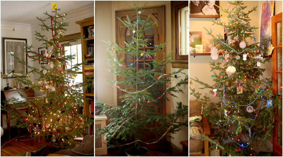 My favorite tree is the smaller one in the dining room. I love that it is simple: no lights, just colorful garland. The tree just rests in a galvanized bucket with moist potting soil. It’s a delicate little thing, and I love the garland so much. I had some crochet chain that we had made previously that we put on this tree, but this year I also bought wool felted balls and strung them on string. It was therapeutic to use a needle and make the garland. I love wool felt, and the garland is colorful and heavy and I pretty much love everything about it. It makes me very happy to walk past this little tree. I will definitely be finding a place to hang that garland after Christmas. It is too lovely to put away.