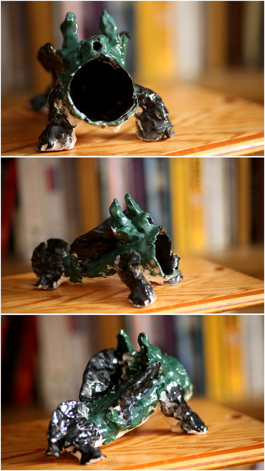 My china cabinet, which came built into a corner in my dining room when we bought our house, is not only filled with sentimental antique relics from grandparents, great grandparents and great grandparents, but also a collection of handmade artifacts like this spooky candy dish, made by Mr. SP at school. I have kid made vases, soap dishes, teapots, tea cups, and now this wonderful candy dish. I love it.