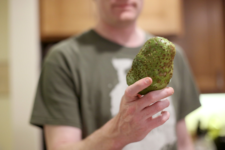This oddly shaped green fruit was a soursop, which was a little overripe as well, but still yummy. The creamy white inside tasted like a cross between a banana and a pineapple.