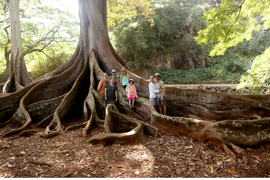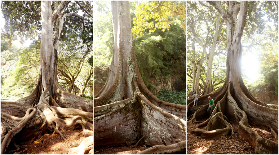 There were three giant Moreton bay fig trees in the garden, and this was probably my very favorite part, because I love the texture of tree roots. The buttressing roots on these trees were amazing. Actually, all three gigantic trees were amazing. I would have liked to spend a few hours just hanging out with the trees. We were on a tour, though, so our time was limited. Here’s a little group picture to help you understand the size of those roots: