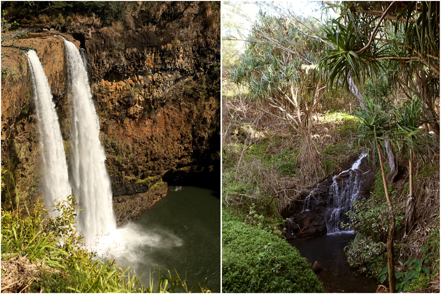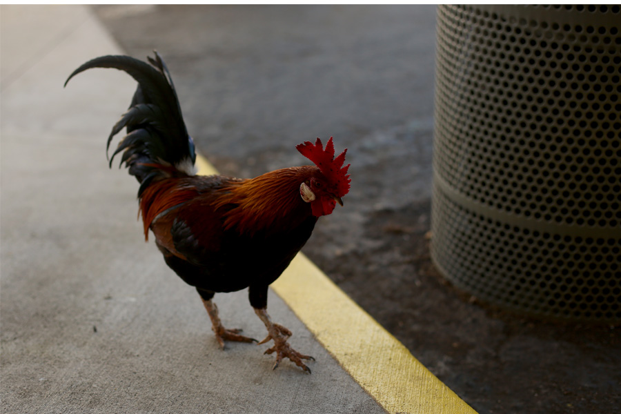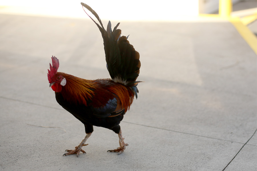 Ornamental chickens! By the hundreds! They run all over the entire island. There are countless roosters, hens, and chicks. We saw them everywhere except at the top of a sheer cliff. They are in the parking lot of the rental cars, at scenic outlooks, on the beach, near restaurants, and in the parks. They stroll down the sidewalks and have no trouble crossing the road (except when they inadvertently become road kill). A few chickens got loose during a hurricane not all that long ago, and they have no natural predators, it seems. There is much clucking and crowing and merrymaking from the poultry population. I’ve always had a big heart for chickens. When we went to the boat company that ran our raft ride, we met a “pet” chicken that hung around the boatyard because the tour guides gave it lots of potato chips and nursed it back from the brink of death. Chickens bring out affection in people, I’m positive of it. Well, maybe not people who are afraid of feathers, but for the average populations, chickens make a nice addition. They fertilize the ground, eat pests, and are a natural alarm clock. Also, they are just plain fun to watch.