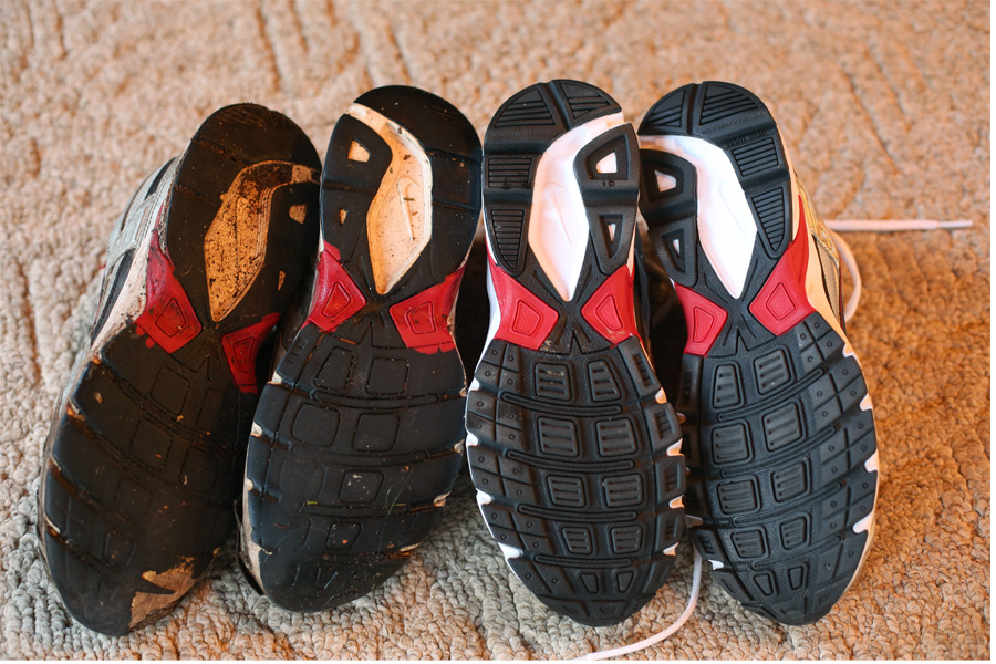 Not only does he outgrow shoes fast, but he also completely wears them out. When he’s done with a pair of shoes, there is truly no life left in them. Last week Dr. Peds looked down at Mr. SP’s very stinky shoes and declared that an intervention was necessary. The old shoes were too small, and they had holes in the bottom and on the sides. Humorously, he actually found the exact same pair of very nice sneakers at the store where he bought the last pair in the fall, and they were on super clearance, a size bigger. Perfect. He brought them home, and the comparison between the two sets of shoes gave me quite a chuckle.