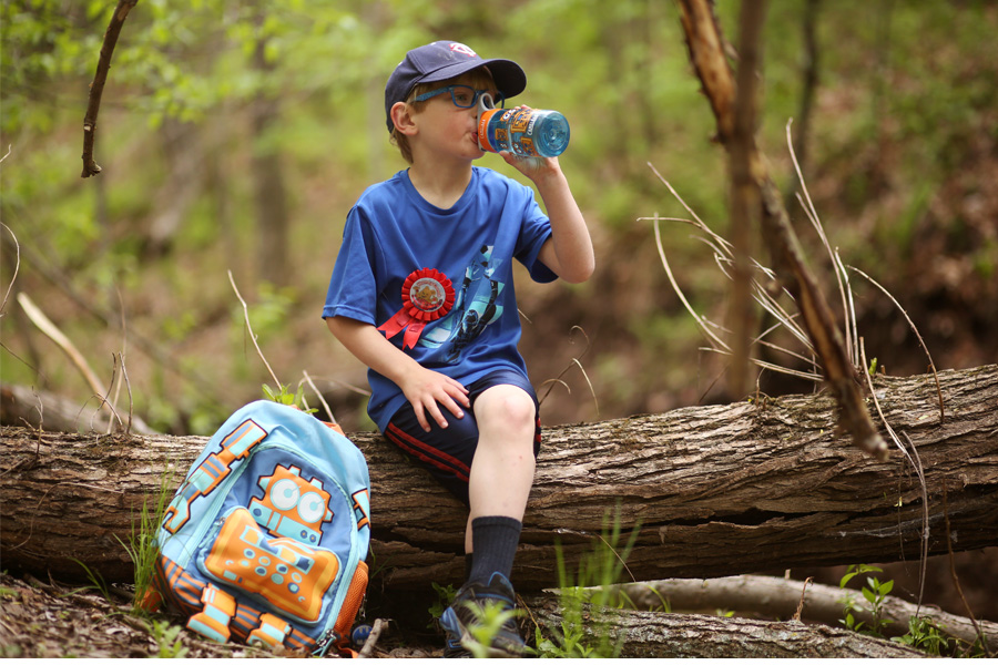 These pictures were taken on a day that was a little cooler and a little buggier. Mr. Trouble on Feet came prepared with a snack in his backpack. He’s very into accessorizing these days, hence the eyeglasses, baseball cap (Papa’s favorite team is the Twins) and his shiny AWANA awards ribbon. He cracks me up daily.
